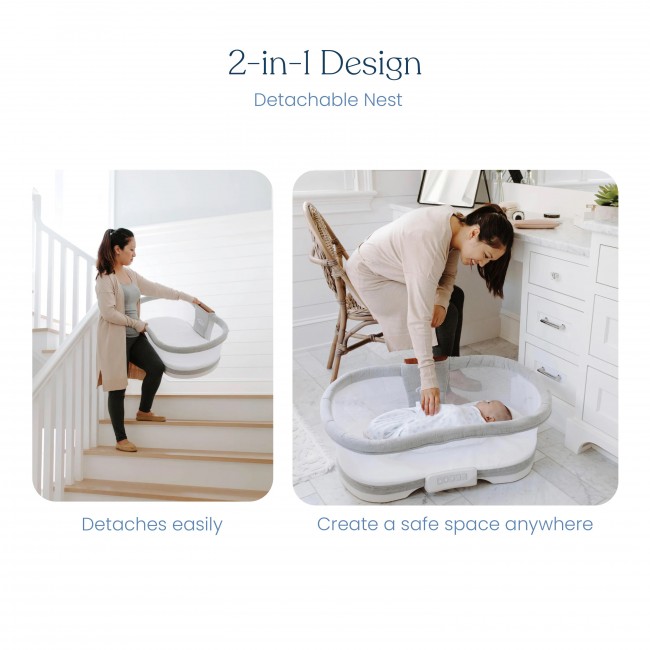 - Detachable nest should ONLY be used while baby is awake and parent is supervising. Baby should not sleep in nest when detached from base or be left unattended. Do not detach nest or move it around the house while baby is inside. When detached, nest should ONLY be used on the floor. Do not use on raised or unlevel surfaces.